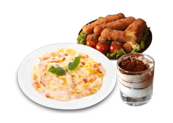 1 Entrée au choix + 1 Plat de pâtes au choix + 1 Dessert au choix.